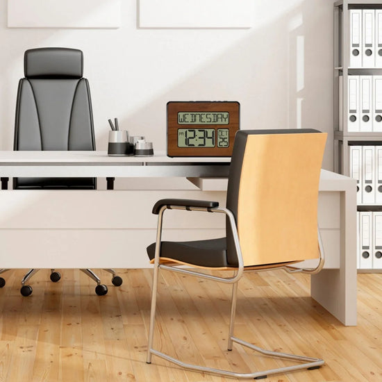 This Atomic Digital Clock ensures precise, self-setting time across 7 U.S. time zones with an extra-large, easy-to-read display. Featuring automatic updates for time and date, alarm functionality, and a low-power indicator, it can be mounted on the wall or placed on a table with its stand—ideal for home, office, or classroom use.